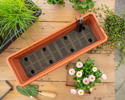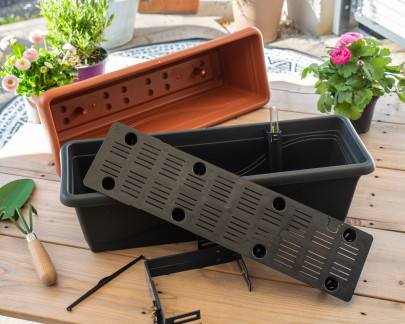 • Frostsicherer Balkonkasten mit SMART BEWÄSSERUNGSSYSTEM, einem kompakten, in sich geschlossenem System zur Messung des Wasserniveaus, welches flexibel am Blumenkasten positioniert werden