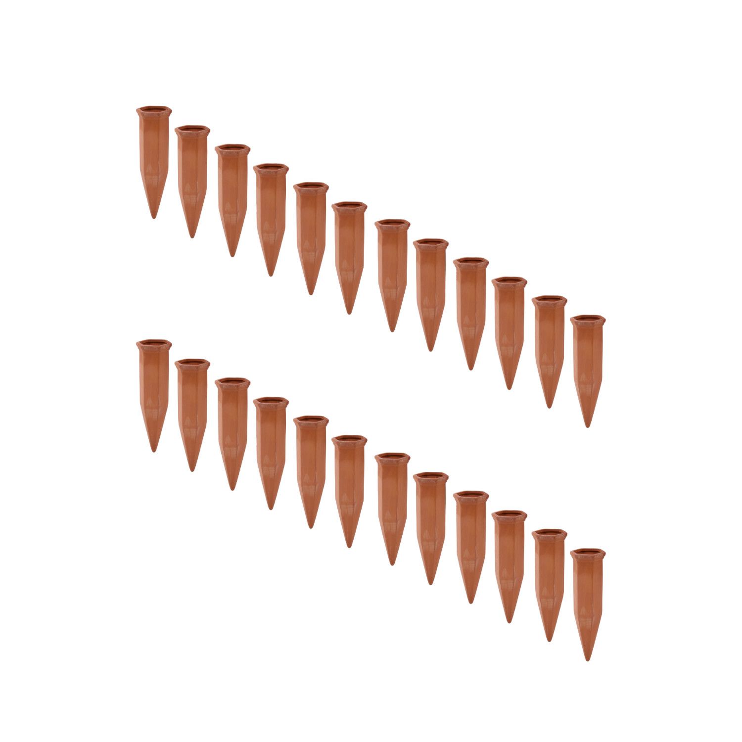Vor Anwendung: Legen Sie den den Rivanto® Bewässerungskegel für mindestens 10 Minuten in Wasser ein, damit er Wasser ziehen kann. Setzen Sie diesen Bewässerungszapfen anschließend auf eine mit Wasser befüllte Flasche auf. Platzieren Sie die PET- oder Weinflasche dann kopfüber in der Erde neben einer Pflanze. Optimalerweise bereiten Sie in der Erde eine kleine Mulde für den Bewässerungskegel vor. Die Pflanzenwurzeln können sich dann stets die benötigte Menge Wasser ziehen. Ideal, wenn Sie im Urlaub sind. Alternativ empfehlen wir die Rivanto® Olla! Ein rundes Tongefäß mit mehreren Litern Fassungsvermögen für größere Blumenbeete.