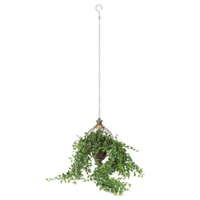 • Stilvolles, kugelförmiges Pflanzgefäß aus Eisen in gealterter Metalloptik mit sanftem Goldton und edlem Kupfer-Look – perfekt für Hängepflanzen im Innen- und Außenbereich.