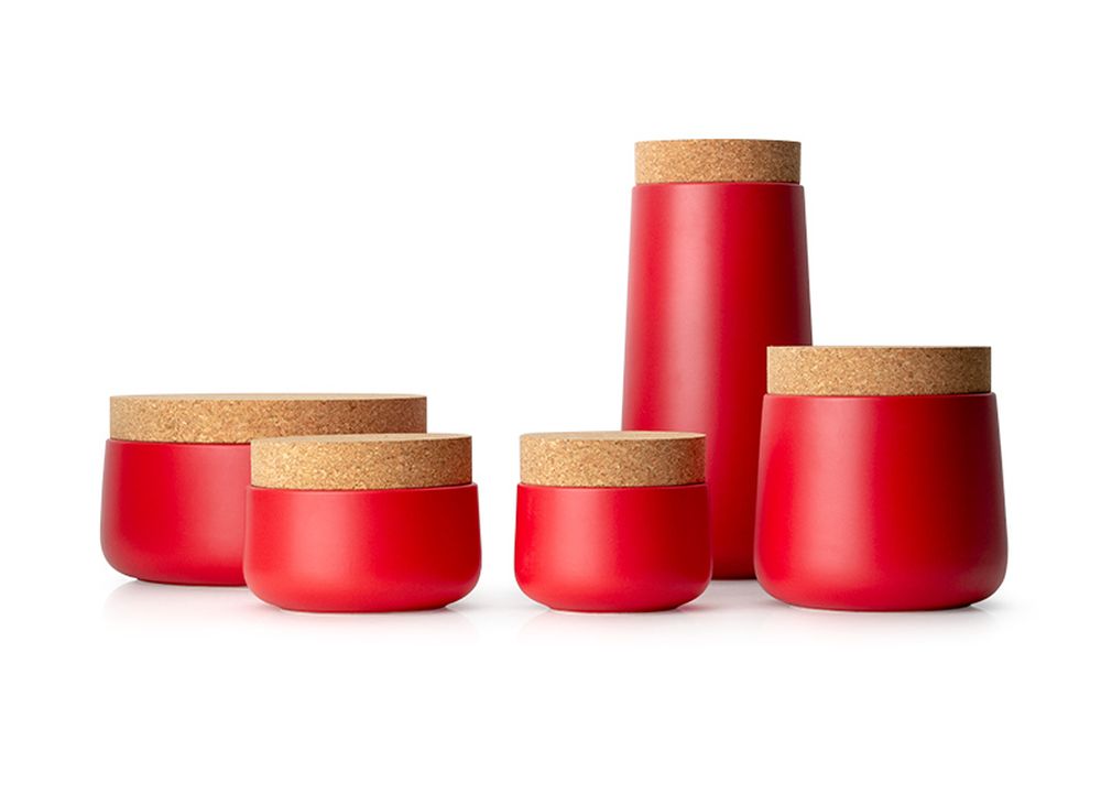 Im Lieferumfang sind fünf unterschiedliche große Keramikdosen mit Korkdeckel matt rot enthalten!