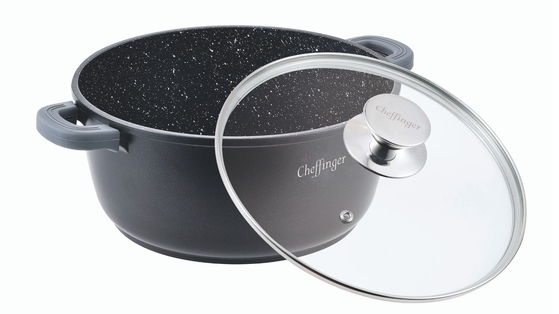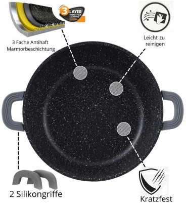 Mit diesem Kochtopf können Sie die köstlichsten Gerichte zubereiten. Der culinario Kochtopf besteht aus Aluminiumguss und hat eine 3-schichtige Antihaft-Beschichtung im Marmordesign. Die Silikongriffe sind praktisch abnehmbar und können erst bei Bedarf auf die Edelstahlgriffe gesteckt werden, z.B. für den Transport des Bratentopfes zum Tisch. Der Topf kann auf allen Herdarten einschließlich Induktion verwendet werden und ist bis 240 Grad im Ofen einsetzbar. Der mitgelieferte Deckel besteht aus gehärtetem Glas und besitzt einen hochwertigen Edelstahl-Knopf.