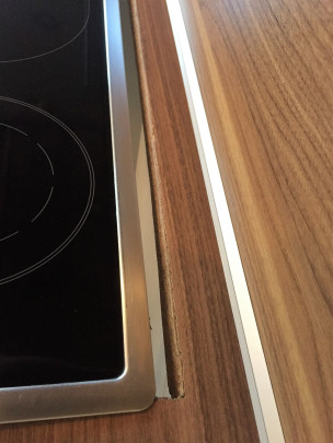 Der Rahmen schließt die offene Lücke zwischen der neuen Herdplatte und der alten Arbeitsplatte.