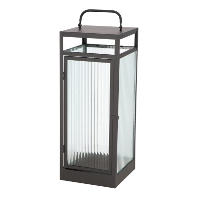 • Laterne aus Eisen und Glas mit gerilltem, mattem Wellenglas – sorgt für sanfte Lichtstreuung und stimmungsvolle Atmosphäre im Innen- und Außenbereich.
