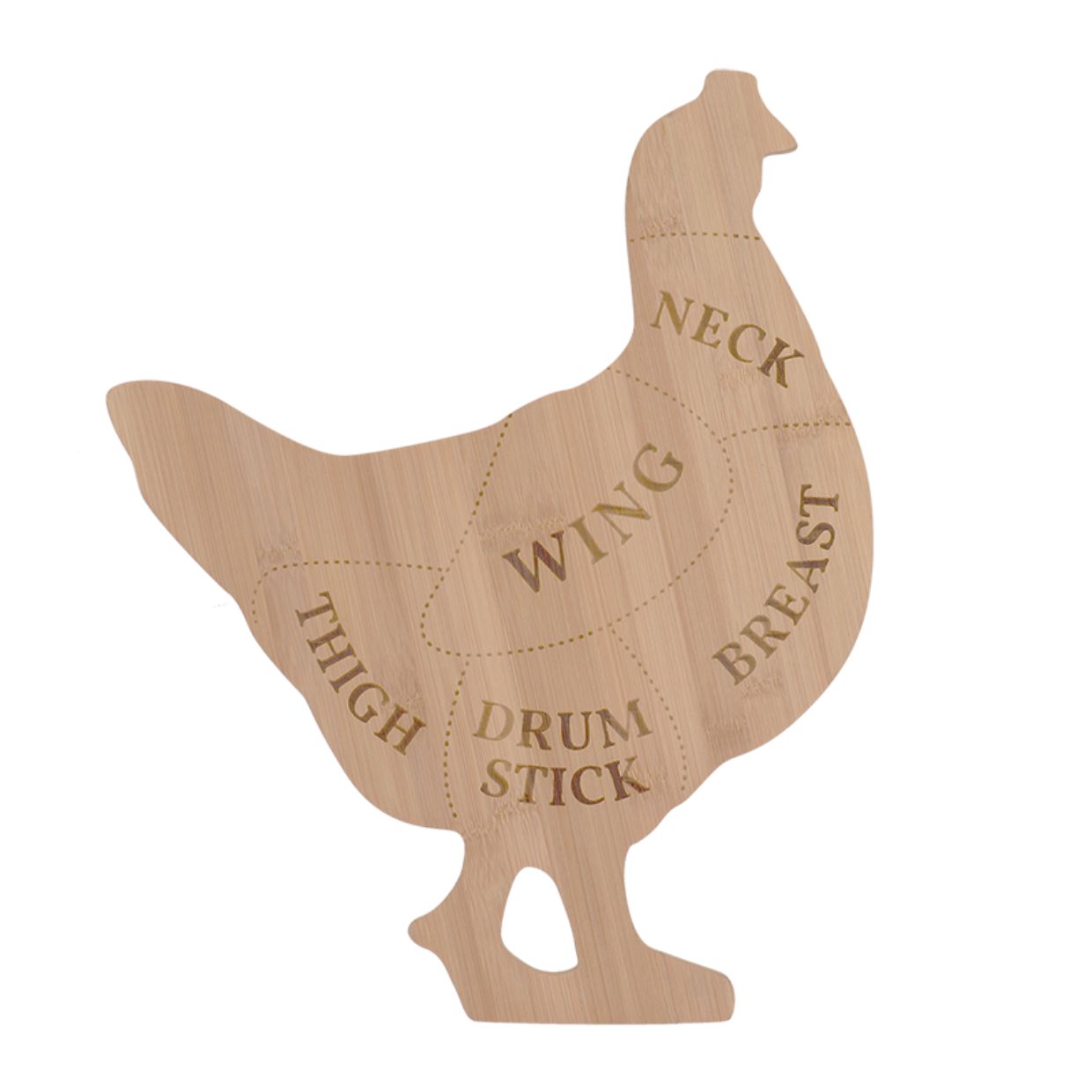 • Küchenbrett im Design Huhn, mit den Fachbegriffen (Englisch) der unterschiedlichen Fleischsorten
