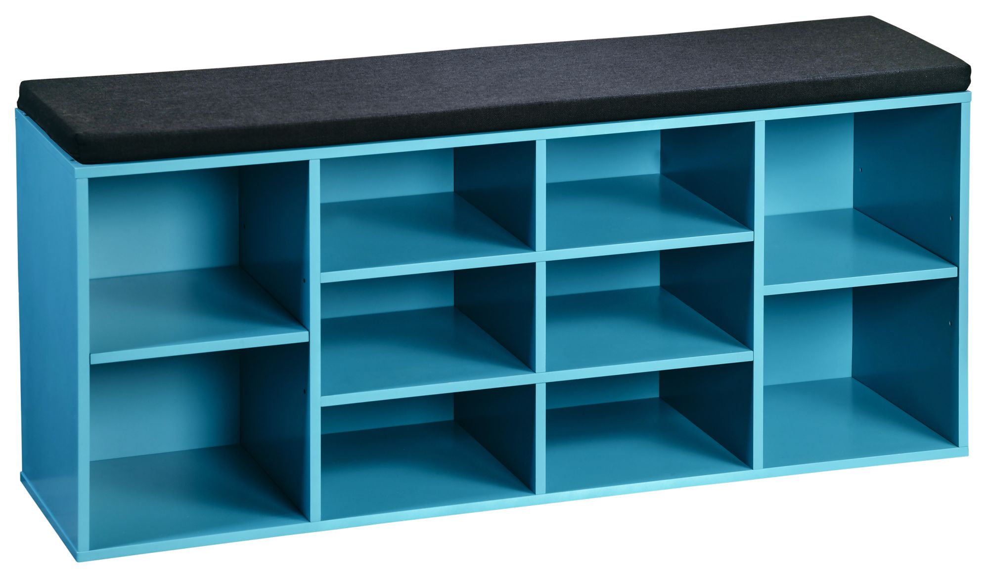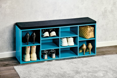 • Stilvoller Schuhschrank in modernem Türkis mit FSC-zertifiziertem Holz und bequemem Sitzkissen aus Stoff, ideal für Flur, Garderobe oder Schlafzimmer.