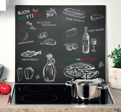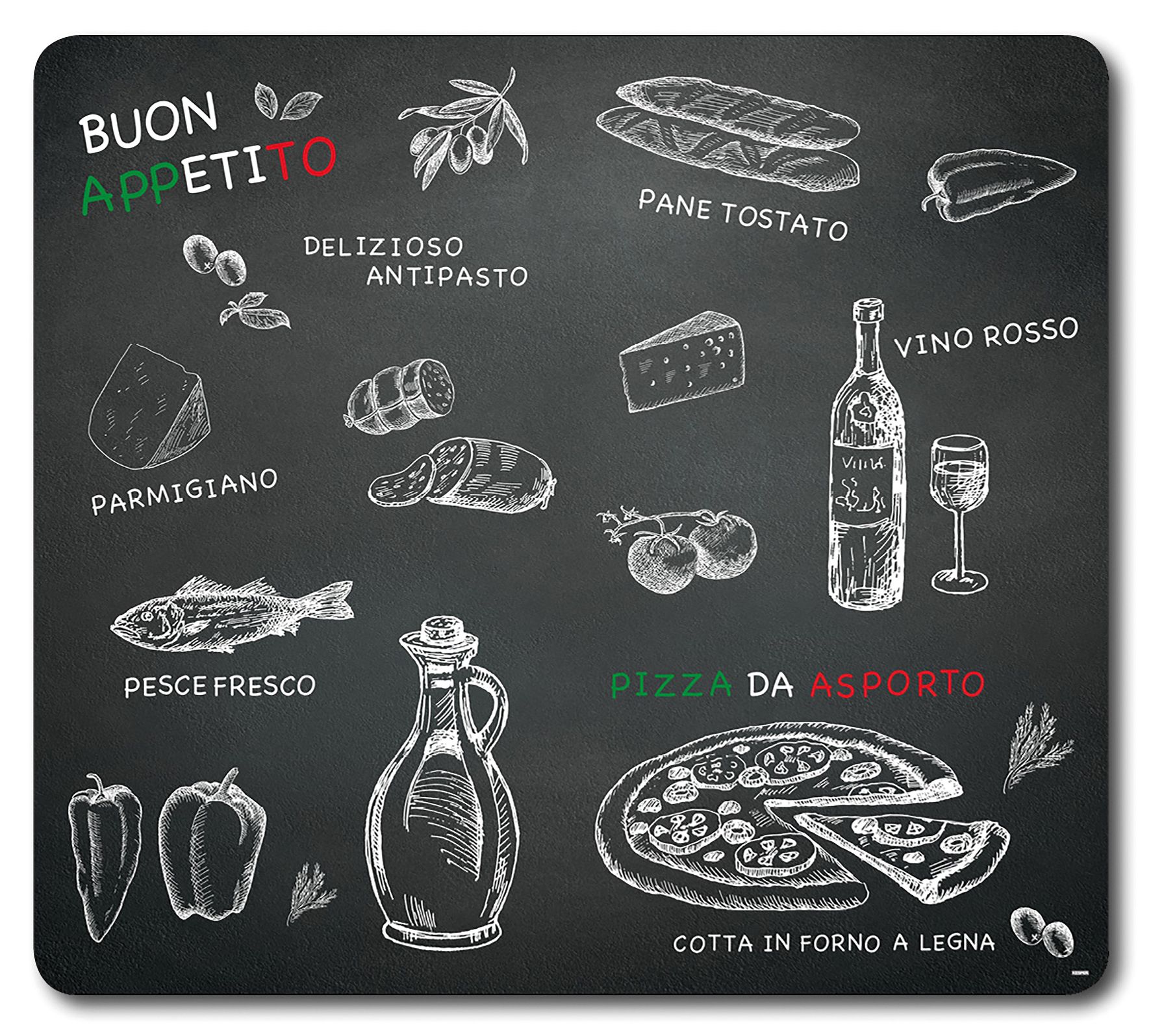 • Glasschneideplatte aus ESG-Sicherheitsglas mit dekorativem Ristorante-Motiv, robust, kratzfest und langlebig für hygienisches Schneiden in jeder Küche.