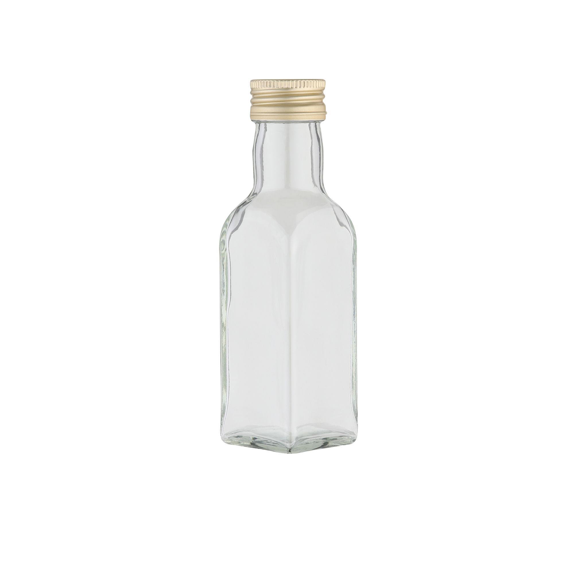 • Elegante eckige Glasflasche mit ca. 100 ml Fassungsvermögen und Schraubverschluss aus Metall. Transparentes Design – ideal zum Abfüllen, Aufbewahren und Präsentieren.