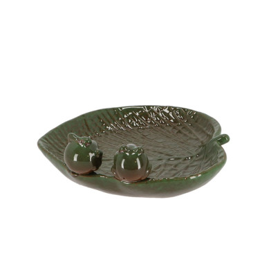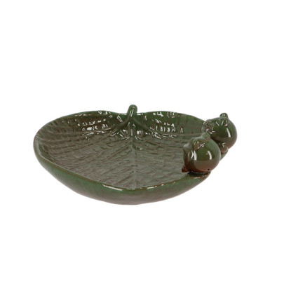 • Die Vogeltränke ist einem Blatt nachempfunden, auf dem zwei kleine Frösche sitzen