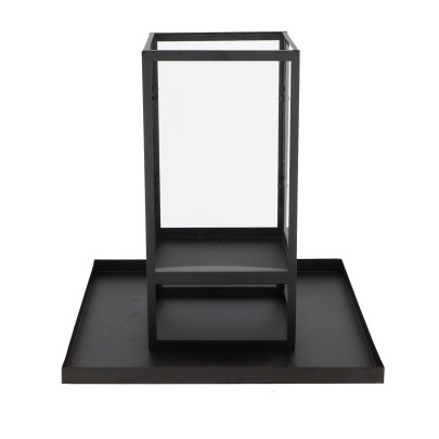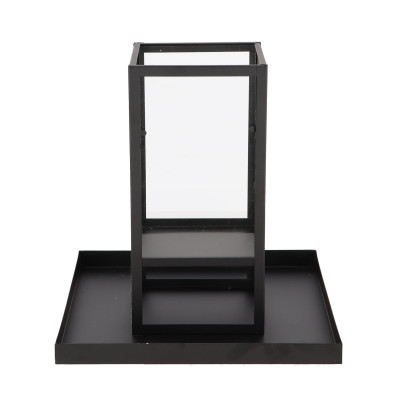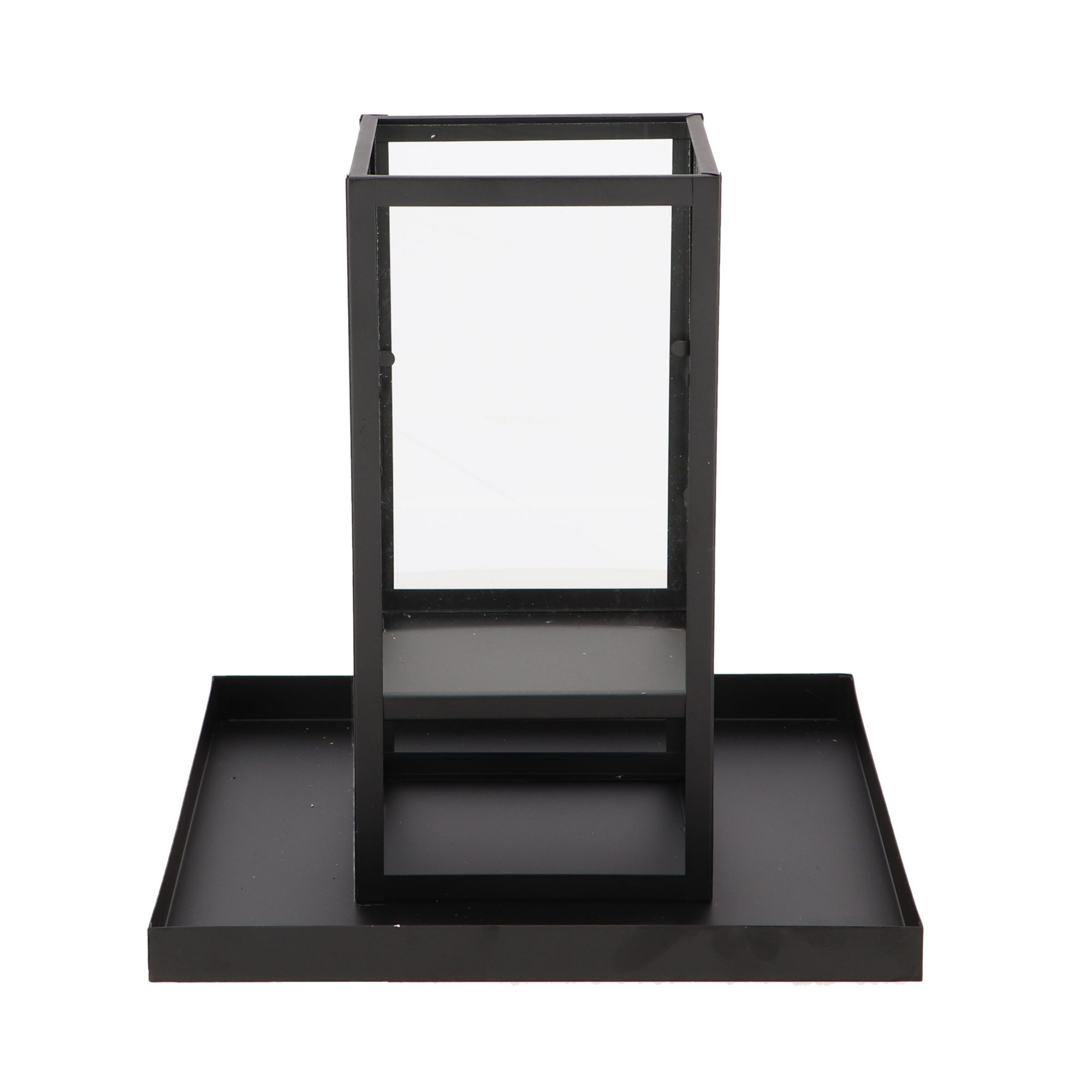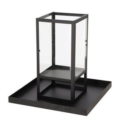 • Erhöhtes Tischwindlicht aus schwarzem Metall auf stabilem Plateau – ideal für stilvolle Tischdekorationen im Innen- und Außenbereich.
