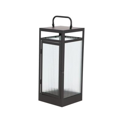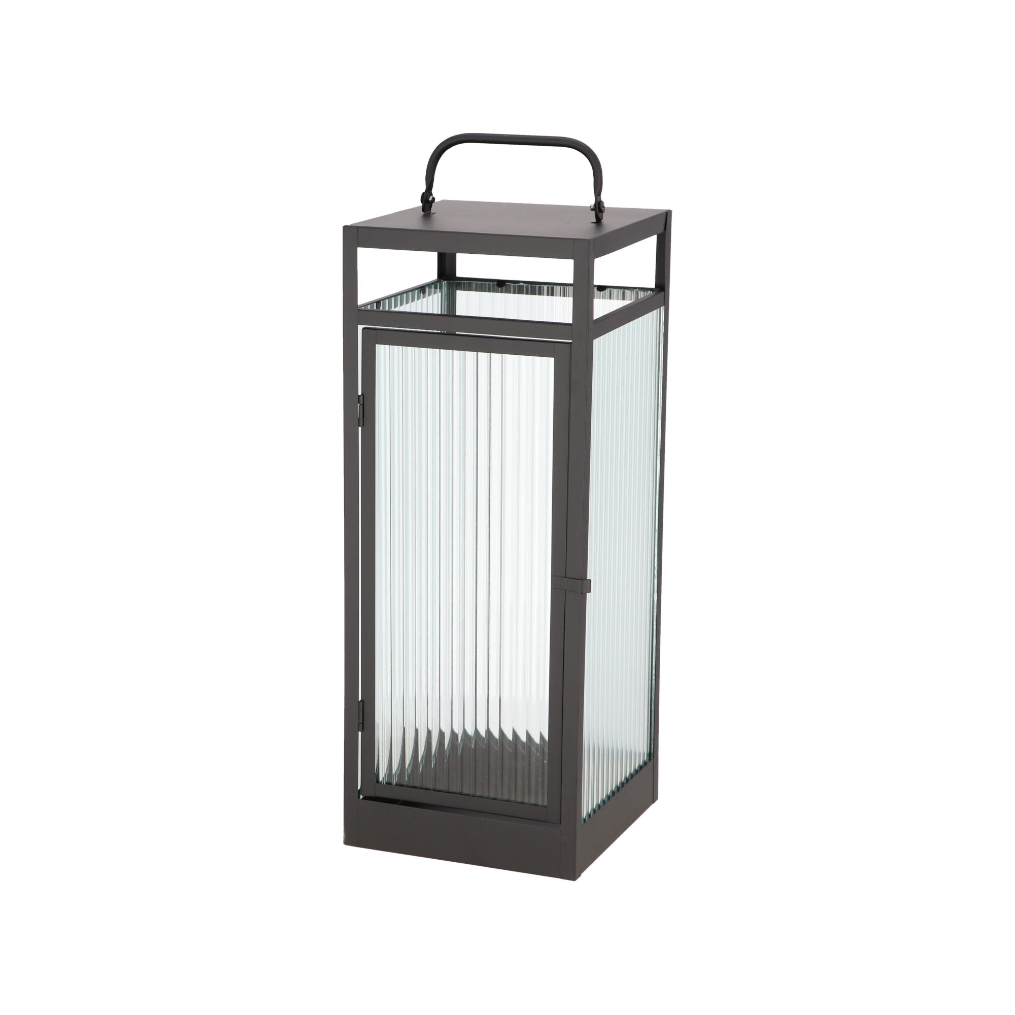 • Edle Laterne aus Eisen und Glas mit gerilltem, mattem Wellenglas – sorgt für sanfte Lichtstreuung und stimmungsvolles Ambiente im Innen- und Außenbereich.